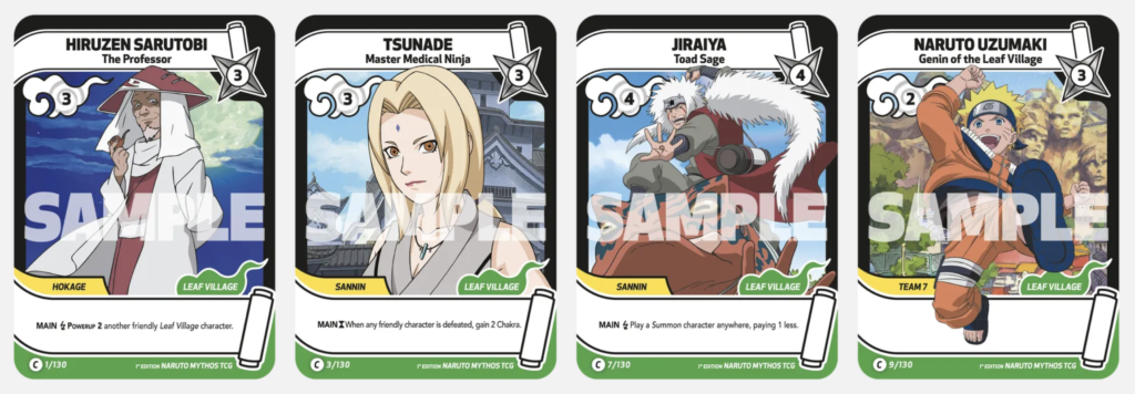 - Naruto Uzumaki : Chakra 2, Power 3, Groupe Leaf Village, Keyword Team 7, effet Rasengan pour cacher ou vaincre ennemis.